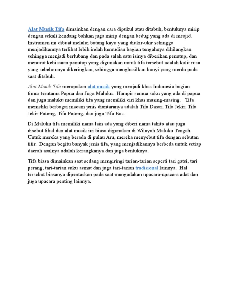 Walaupun demikian, istilah ini umumnya diperuntukkan bagi alat yang khusus ditujukan untuk musik. Cara memainkan alat music ini adalah dengan cara ditiup.dan alat music ini biasanya juga digunakan untuk pemberitahuan musibah. Alat musik tekan memiliki tiga jenis yaitu: Gabungan dari beberapa tifa akan menghasilkan irama musik yang sangat dinamis. Cara memainkannya beranekaragam dengan menggoyanggoyangkan, memukulnya, ditepuktepukkan, dan lainlain.